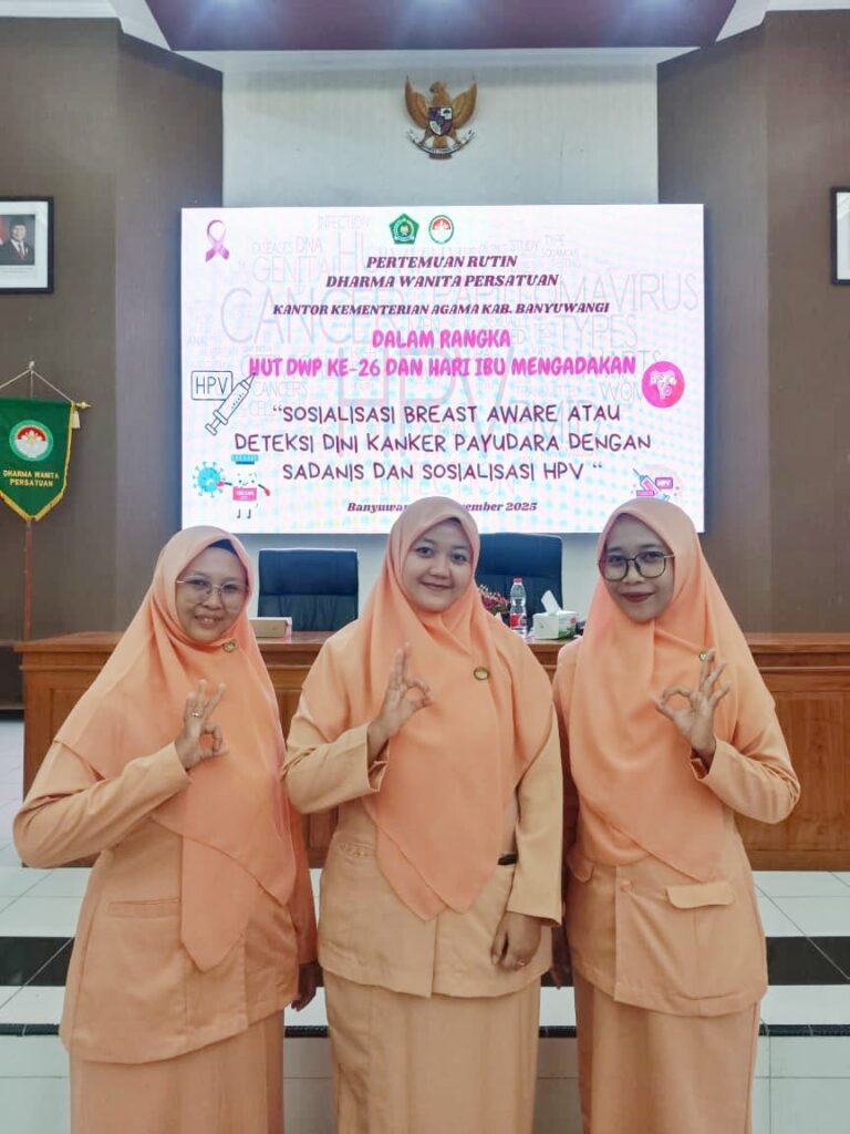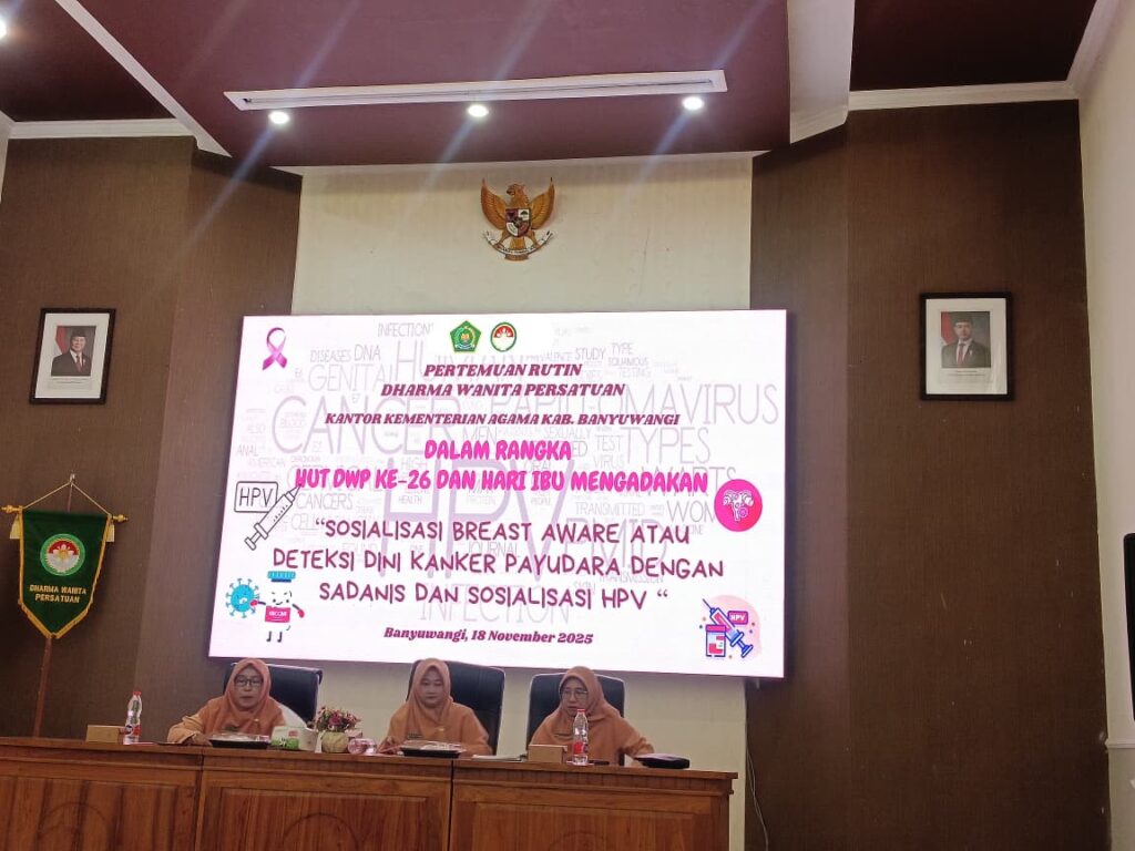 Banyuwangi, 18 November 2025 — Dharma Wanita Persatuan (DWP) Kementerian Agama Kabupaten Banyuwangi kembali menggelar pertemuan rutin yang kali ini dikemas lebih istimewa. Dalam rangka memperingati HUT Dharma Wanita Persatuan dan Hari Ibu, kegiatan diawali dengan pelaksanaan Tes Sadanis (Pemeriksaan Payudara Secara Klinis), IVA, dan HPV DNA yang bekerja sama dengan Puskesmas Sobo Banyuwangi.