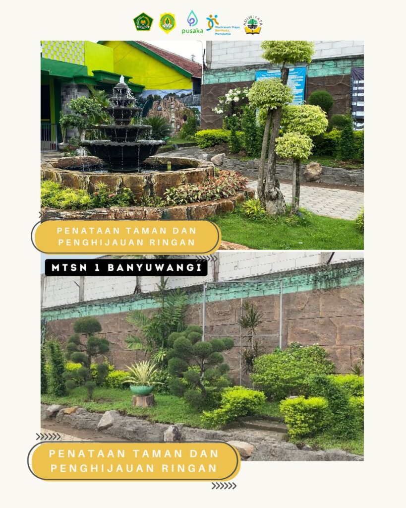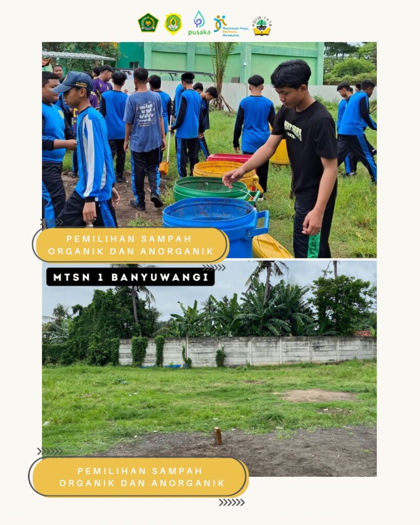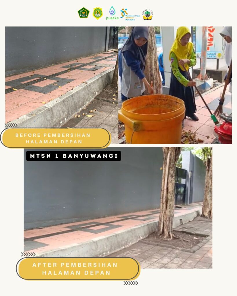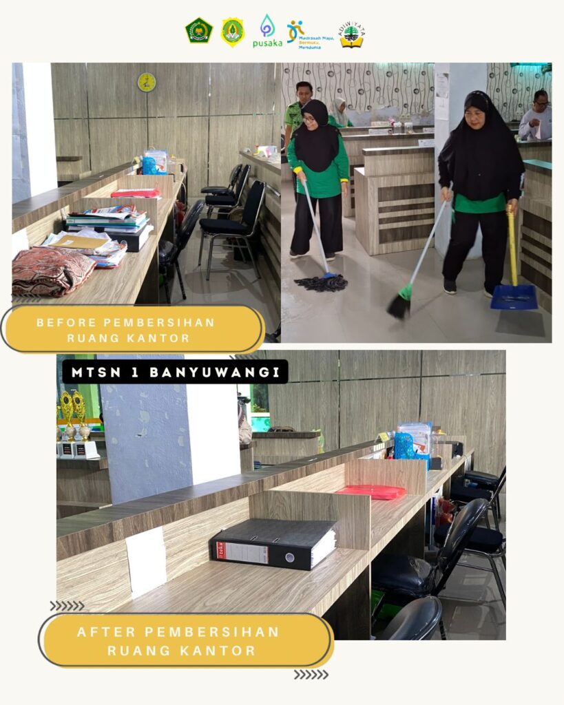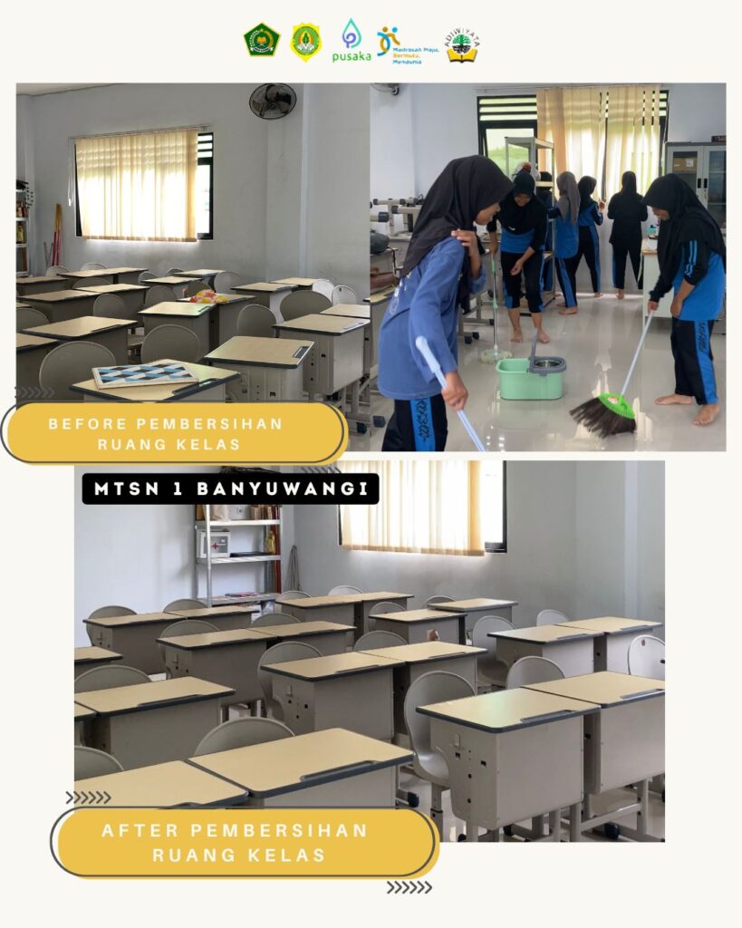 Dilanjutkan dengan kegiatan pembersihan kelas, kantor, dan halaman oleh seluruh warga Madrasah. Tak hanya para siswa/i Madrasah, namun para guru dan staf Madrasah juga turut andil membersihkan lingkungan madrasah secara gotong royong. Kegiatan bersih-bersih dilaksanakan mulai dari pembersihan masing-masing ruangan hingga halaman madrasah. Selain itu, siswa dan siswi MTsN 1 Banyuwangi juga turut mempelajari penerapan sistem pemilahan sampah organik dan anorganik yang didampingi langsung oleh para guru.