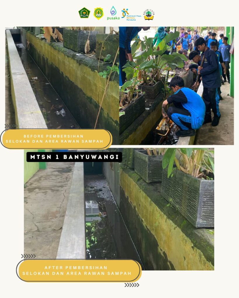 Kegiatan bersih-bersih diikuti oleh seluruh warga MTsN 1 Banyuwangi dan dilaksanakan dengan penuh semangat serta antusias. Semangat bergotong royong para warga MTsN 1 Banyuwangi membangun dan menjaga lingkungan madrasah menjadi lebih bersih dan sehat.